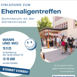 Liebe Ehemalige des Gymnasiums an der Gartenstraße, am Samstag, 15. November 2025, laden wir euch herzlich zu unserem Ehemaligentreffen ein! 🕐 13:00 – 15:00 Uhr 📍 In der Schule – direkt im Anschluss an den Tag der offenen Tür Kommt vorbei, trefft alte Bekannte, erinnert euch an gemeinsame Schulzeiten und erfahrt, was sich an eurer alten[…]