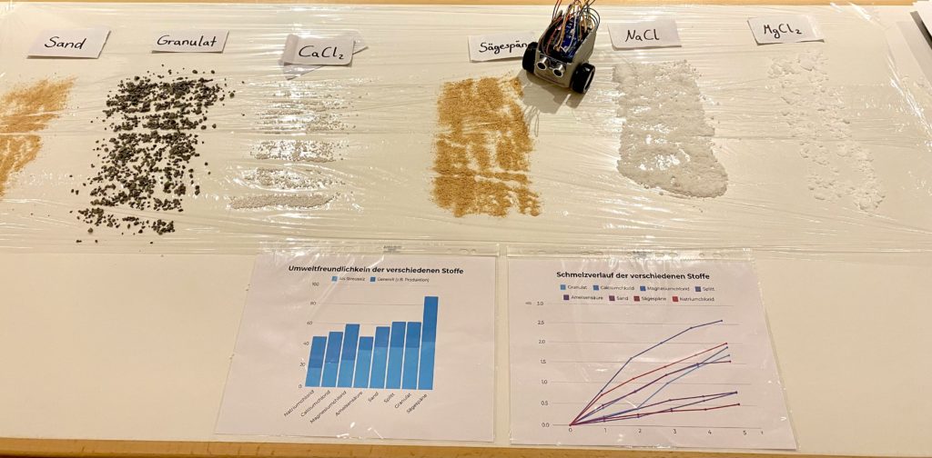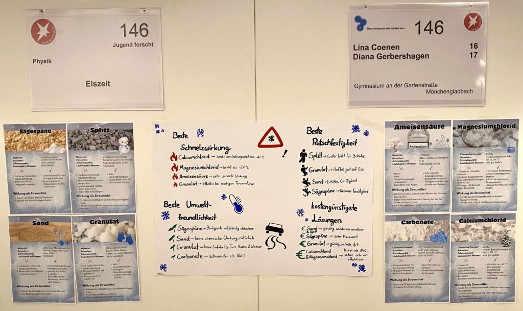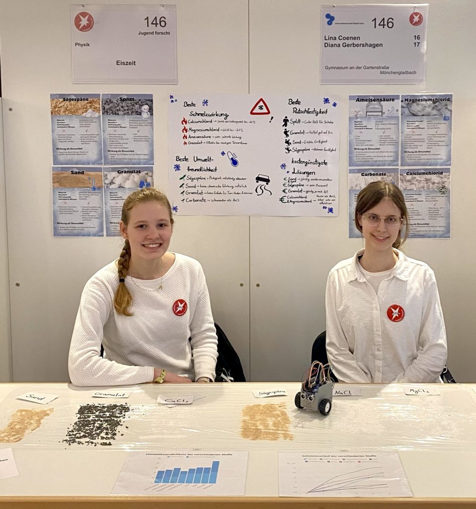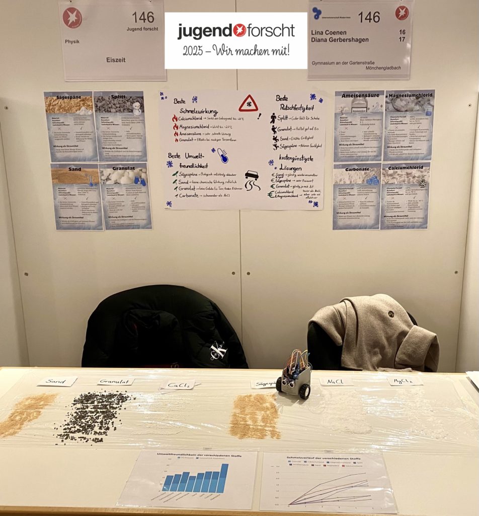 Lina und Diana (EF) haben heute für das GymGa mit ihrem Projekt „Eiszeit- Erforschung & Evaluation einer umweltfreundlichen Alternative zum klassischen Streusalz“ am Regionalwettbewerb Jugend forscht in Krefeld teilgenommen. Im Rahmen ihrer Forschung haben sie nicht nur die Umweltauswirkungen verschiedener Stoffe untersucht, sondern auch deren Effektivität bei der Verringerung der Rutschgefahr auf Glatteis getestet und die Kosten-Nutzen-Bilanz evaluiert. Ihr Projekt vereint kreatives und problemlösendes Denken und zeigt das starke Bewusstsein für Nachhaltigkeit und Umweltschutz unserer Schüler:innen. Ein herzliches Dank geht dabei auch an Herrn Harnischmacher, der das Projekt im Rahmen der Jugend forscht AG betreut hat.