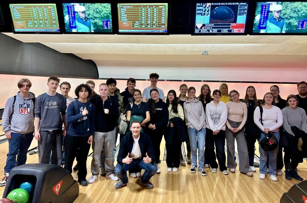 Mit Hilfe der automatisch von der Bahn gemessenen Geschwindigkeit unserer Bowlingkugeln konnten wir die beim Aufprall auf die Pins wirkenden Kräfte und den Impuls, der auf die Pins übertragen wurde, bestimmen. Dabei stellten wir fest, dass die Geschwindigkeit der Kugel einen entscheidenden Einfluss darauf hat, wie viel Kraft beim Aufprall ausgeübt wird. Jedoch führte eine hohe Geschwindigkeit nur dazu, dass die in der direkten Wurfbahn stehenden Pins umfielen, während die perfekte Mischung aus Geschwindigkeit und Drehimpuls dazu führte, dass alle Pins abgeräumt werden konnten. Dabei konnten wir beobachten, dass das faszinierende Zusammenspiel der im Unterricht gelernten physikalischen Gesetzmäßigkeiten Bowling zu mehr als nur einem Spiel der Geschicklichkeit macht. Es ist ein wunderbares Beispiel dafür, wie gut ein Verständnis der Physik den „Bowling-Erfolg“ beeinflussen kann. Natürlich durfte nach der theoretischen Auseinandersetzung auch der Spaß nicht zu kurz kommen und so versuchten wir mit möglichst kreativen Wurfstrategien alle Pins abzuräumen.