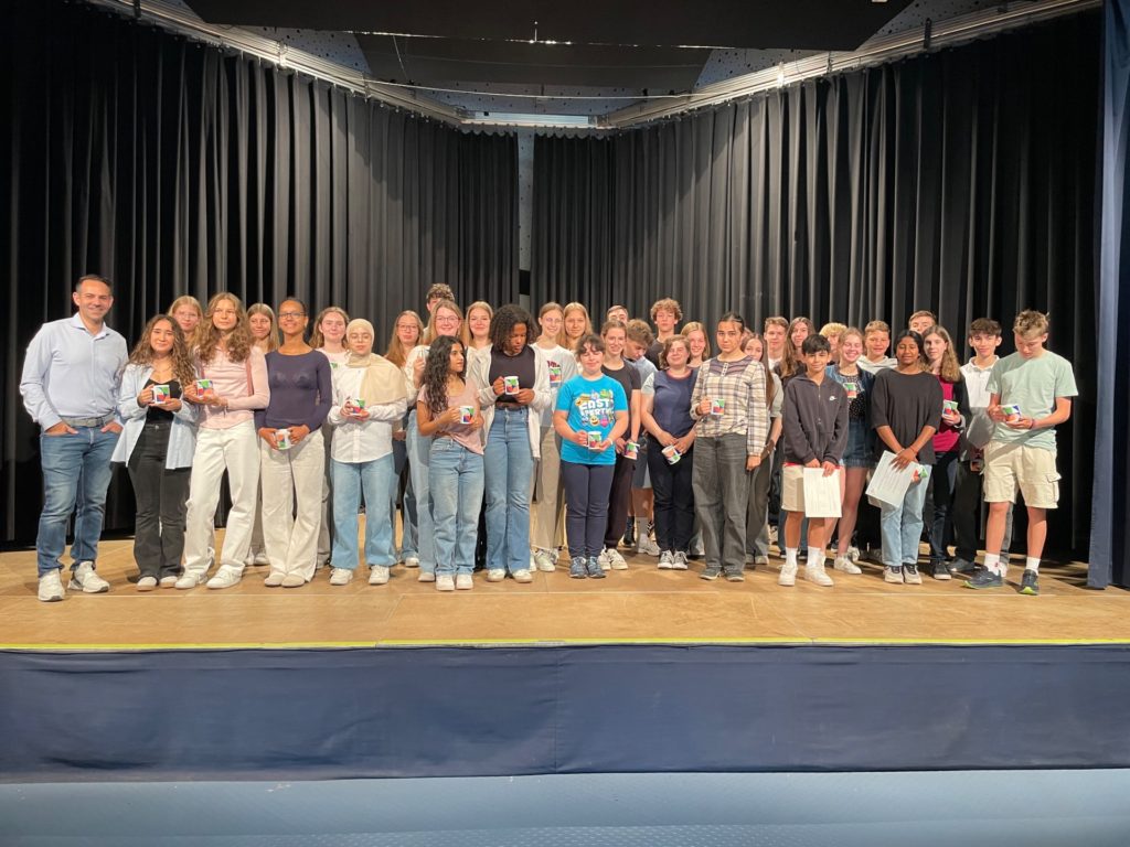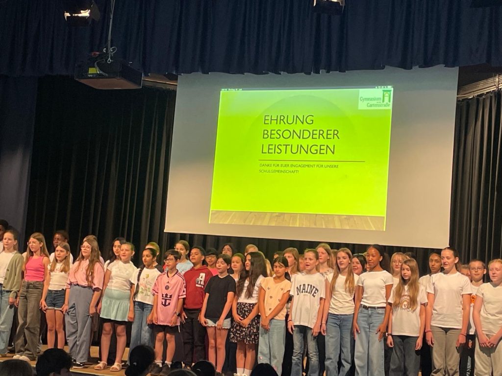 Am heutigen letzten Schultag durften wir in der Aula zahlreiche Schülerinnen und Schüler für ihr besonderes Engagement innerhalb und außerhalb unserer Schulgemeinde ehren. Ob als Streitschlichter:innen, Mitglieder der Schülervertretung, Teilnehmende an Wettbewerben oder Unterstützer:innen im Technikteam und Sanitätsdienst – ihr habt euch mit Herz und Einsatz für das GymGa eingebracht. Musikalisch eingerahmt wurde das schöne kleine Fest vom Schulchor unter der Leitung von Frau Gillet. Als Zeichen der Anerkennung überreichten Herr Giunta und Herr Jungbluth allen Geehrten eine GymGa-Tasse – ein kleines Dankeschön für großes Engagement. Ihr seid das Gesicht unserer Schule – und wir sind stolz auf euch!