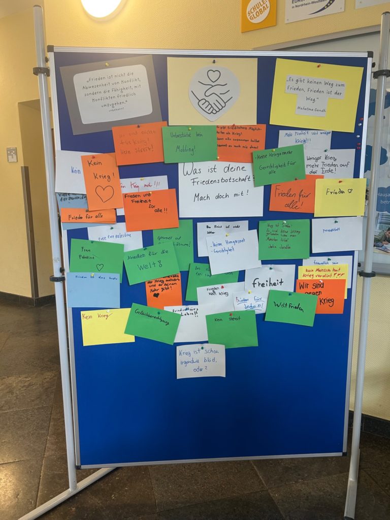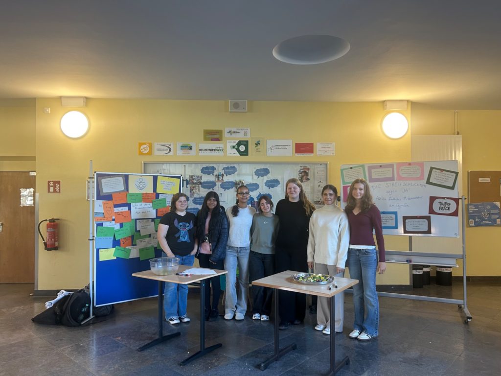 Zum Weltkindertag (20.09.) haben unsere Streitschlichter:innen am Montag (22.09.) ein Zeichen für Frieden und Zusammenhalt gesetzt! Auf Stellwänden konnten alle ihre eigenen Friedensbotschaften hinterlassen – eine kleine Erinnerung daran, dass alle zu einem friedlicheren Umfeld beitragen können. Passend dazu konnte man sich leckere selbstgebackene Kekse schmecken lassen. Mit dieser Aktion machten sie nicht nur auf die Bedeutung des Weltkindertags aufmerksam, sondern auch auf ihre tägliche Arbeit: Sich für ein friedliches Miteinander am GymGa einzusetzen.