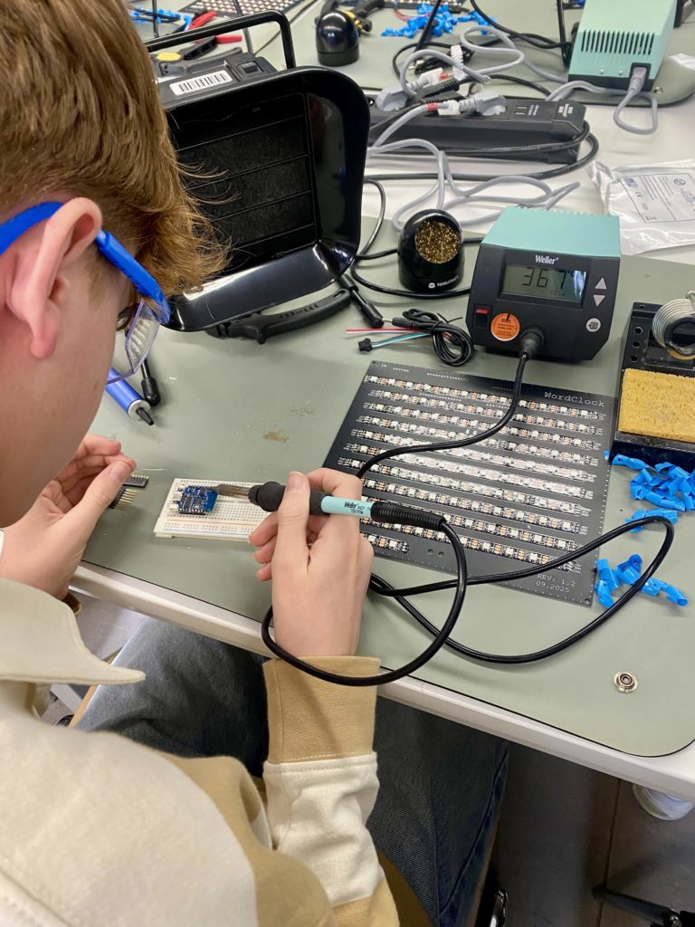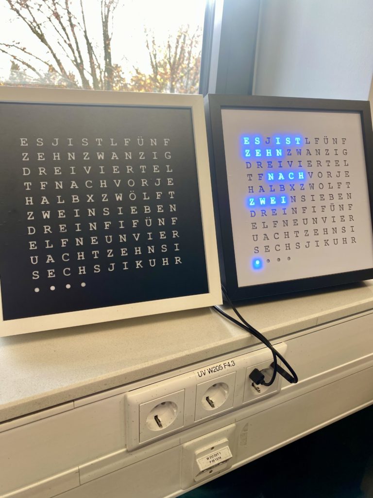Dabei erhielten wir Einblicke in die praktischen Anwendungen von Technik im Alltag & Forschung. Unter Anleitung mehrerer Dozenten bauten wir Wordclocks. Bei einer Wordclock zeigt die Uhr die Uhrzeit in Form von Wörtern anstatt von Ziffern an. Nach ca. 8 Stunden hatten wir es geschafft und unsere Wordclock, die mithilfe von LEDs und einer speziell entwickelten Software die Uhrzeit in klaren, lesbaren Worten anzeigt, war fertig.